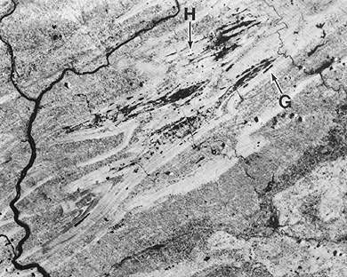 `**1-17:** <>`__ **There are dark patterns, one elongate, the other as three spots, near the tips of arrows G and H. What do you think these are? Can you find them in corresponding local areas in the October 1972 MSS Band 7 image? What's going on? ANSWER **