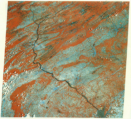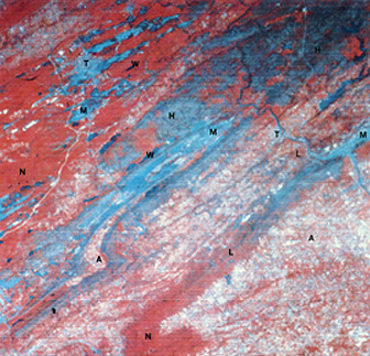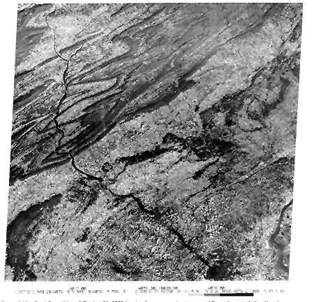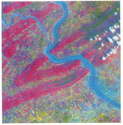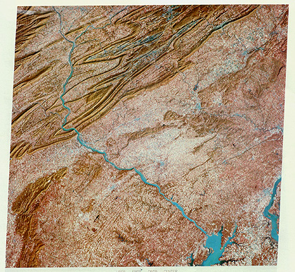 `**1-8:** <>`__ **Now examine the full MSS false color image of this region as seen on June 8, 1977. Account for the large areas in blue. Take note of the dark grayish-black patches on some of the ridges; there are also some blackish area in the valleys between ridges, primarily in the upper third of the image. We will take note of these special features later in this exam. Note the course of the Susquehanna River in the lower third of the image. At several places the river widens noticeably. Can you explain this. ANSWER **