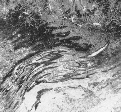`**1-10:** <>`__ **A Landsat 2 MSS Band 5 scene, taken on January 23, 1979, is reproduced below. Comment on differences you note in this image from those we've examined before. How might one distinguish snow from clouds? ANSWER **