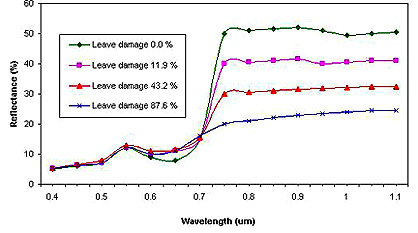 原则上,实际LAI必须在现场直接通过剥除所有叶片来确定,但在实践中,可以通过统计抽样或测量一些特性(如反射率)来估计。因此,遥感可以确定一个LAI估计,如果反射符合适当的领域或地面真相。对于遥感作物,LAI受植株间反射土壤量的影响(因此,从侧面看,直下可以看到玉米和土壤,但在成熟时,玉米地似乎距离很近)。对于下面所示的光谱特征,近红外反射率将随着LAI的增加而增加。