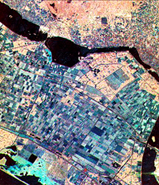 雷达同样可以探测农田土壤湿度的变化。下图是位于亚利桑那州凤凰城附近马里科帕的一个实验站的C波段机载SAR图像。较暗的区域是那些既有较高湿度又有生长作物的区域,在这种情况下,向SAR接收器产生的回报较少。