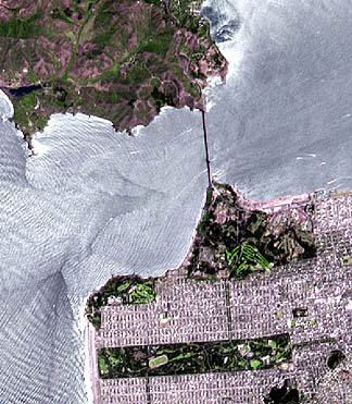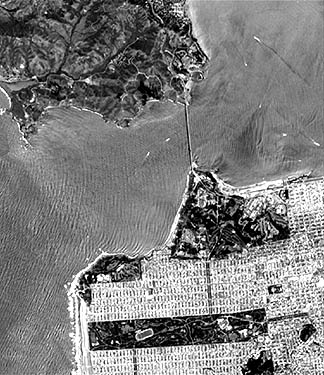 SPOT提供了相当简单的合并的很好的例子:20 m HRV多光谱数据与10 m HRV泛(色)传感器。前两对场景展示了旧金山的一部分,包括金门公园、普雷西迪奥、金门大桥和索西利托在马林县。左侧图像为20米准自然色视图;右侧图像为同一区域的黑白10米分辨率图像。两个场景都是同时拍摄的。