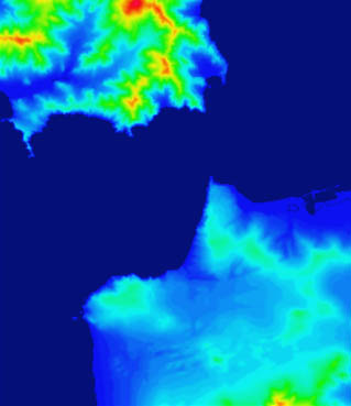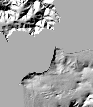 在前几节中,我们展示了几个将空间图像与DEM高程数据相结合以生成透视图的示例。我们可以用上面的场景来做这个。首先,DEM数据显示在彩色编码的通用地图中,高海拔为红色,最低海拔为中蓝色(海洋深蓝色)。然后输入到右侧的阴影地形图:
