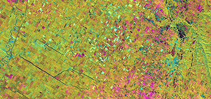 第一个主题是作物田和雷达的最后一个主题。下面是马尼托巴红河流域的SIR-C图像。彩色合成中的两个波段来自JPL操作的L波段和C波段雷达系统。第三种是德国-意大利空间联盟开发的X波段仪器。所有这些装置都安装在从航天飞机伸出的动臂上。由于图像是同时拍摄的,因此时间因素被消除。但是这两种仪器在空间采样中并不完全兼容,因此像素需要合适的算法来允许合并,在某些情况下,在视角和偏振方面也存在差异。