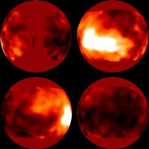 当土卫六旋转时,大气中的一些变化可以被辨别出来。以下是通过哈勃太空望远镜获得的四个视图: