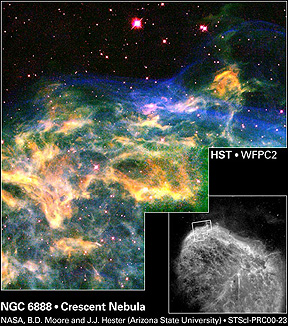 第四个例子是新月状星云。下图右下角是一个黑白的地面望远镜观测到的椭圆(16×24光年)气云,由濒死的恒星WR 136向外吹的强烈恒星风推动,这是一颗沃尔夫-雷耶特恒星(来自一个超级红巨星,非常热,因此外部质量损失)。有裸露的氦,甚至氮或碳的内壳(见 page 20-7 )颜色部分是星云部分外缘的HST视图;不同的颜色与组成变化有关。