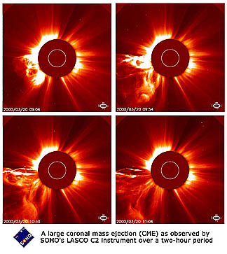 CME在短时间内排出大量粒子。以下是2000年3月20日发生的CME的四面板时间序列: