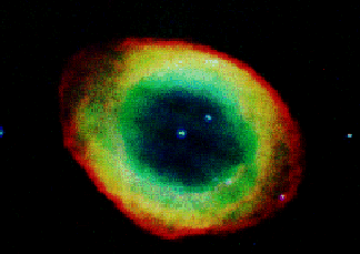 经典的例子是M57,环星云,如hst所见(红色代表激发的氢;绿色与电离的氧有关)。