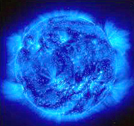 SOHO可以在极端紫外线波长区域对太阳进行成像。这里是一个蓝色的视图,用来突出紫外线中看不见的波长。极热气体的羽流从太阳的不连续位置进入色球层。