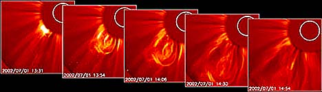 SOHO能够对图像进行延时处理,以便将耀斑(突出)的历史或序列显示为一系列。这张图片显示了在SOHO上用lasco传感器观察到的日珥的生长和消散的连续性。该仪器还提供温度数据,对于构成该特征的气体,平均温度为107000°K。