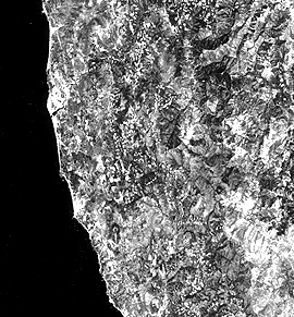 1986年在法国发射的SPOT-1上首次在无人驾驶的地球观测航天器上使用基于CCD的Pushbroom扫描仪。 (Page 3-2 _介绍了SPOT系统,该系统作为一个商业程序运行;目前已经推出了4个SPOT系统)一个SPOT图像的例子,来自其高分辨率视频(HRV)摄像机,覆盖俄勒冈州西南部沿海地区60公里的部分(20米的空间分辨率),是我们展示的下一个图像。W.注意,扫描线不存在,因为每个CCD元件实际上是一个类似于像素的微小区域。