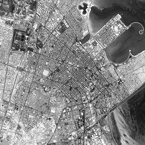1993年5月,MOMS-2在STS-55上飞行。它有四个多光谱通道(13米分辨率)和一个全色波段(4.3米),并处于立体声模式。这是波斯湾西岸一座城市的全色图像(可能在卡塔尔)。