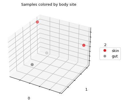 >>> fig = pcoa_results.plot(df=df, column='body_site', ... title='Samples colored by body site', ... cmap='Set1', s=50)