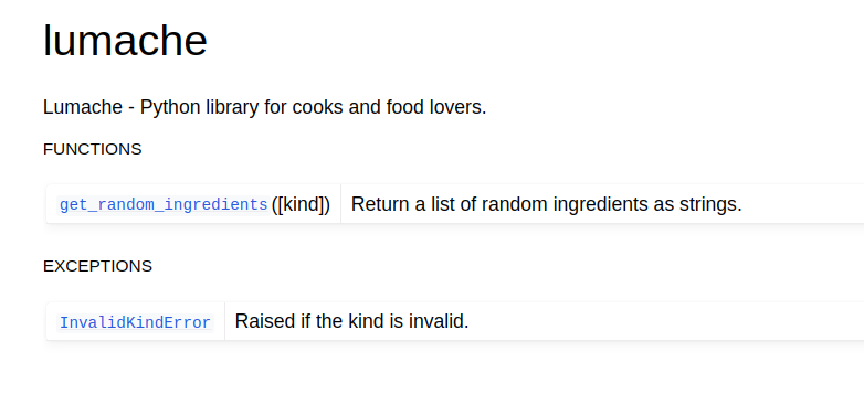 api.html,对应于docs/source/api.rst并包含一个表,其中包含您在autosummary指令(在本例中,只有一个)。generated/lumache.html,对应于新创建的reStructuredtext文件generated/lumache.rst并包含模块成员的摘要,在本例中是一个函数和一个异常。