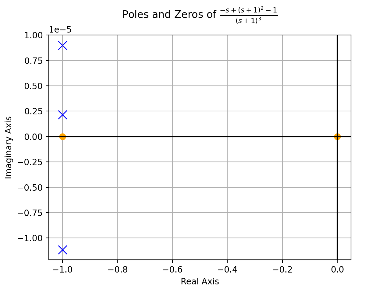 Poles and Zeros of the system elements (individual Transfer Functions in Transfer Function Matrix) in the Laplace domain (Note: The actual poles and zeros of a MIMO system are NOT the poles and zeros of the individual elements of the transfer function matrix). Also, visualise the poles and zeros of the individual transfer function corresponding to the 1st input and 1st output of the G(s) matrix.