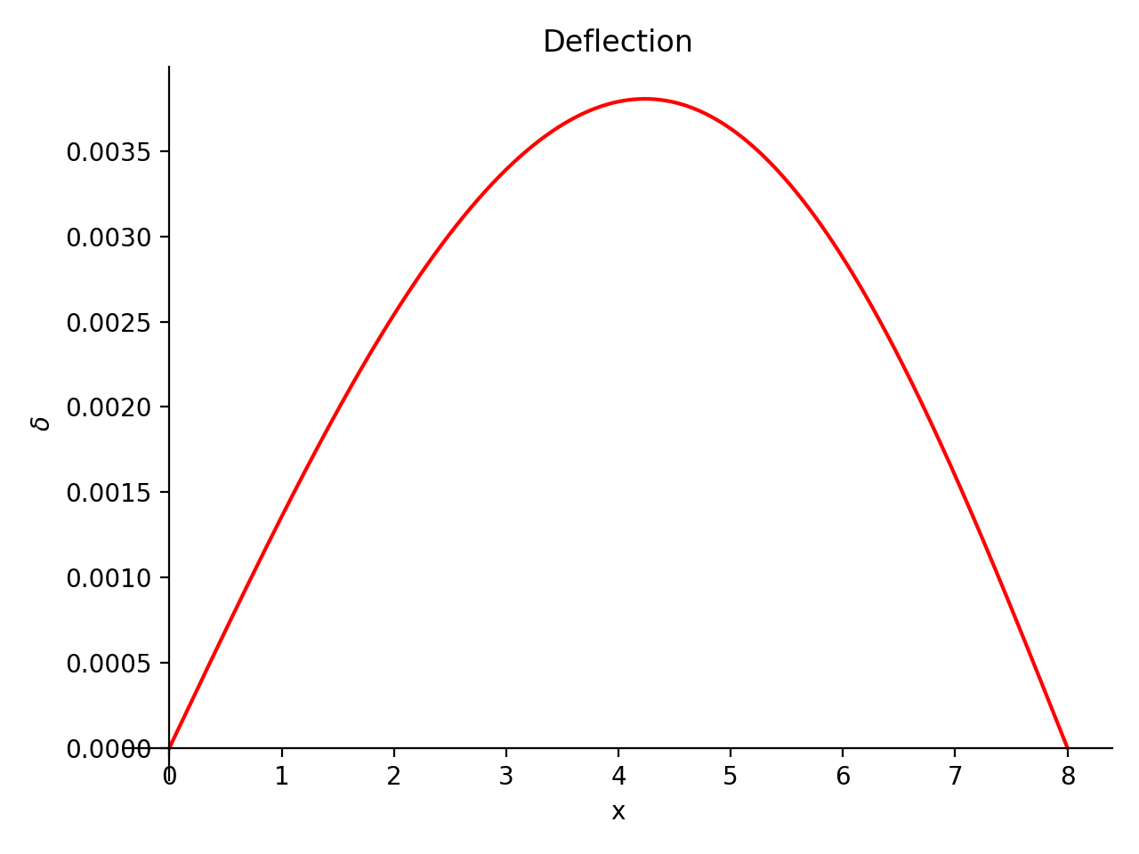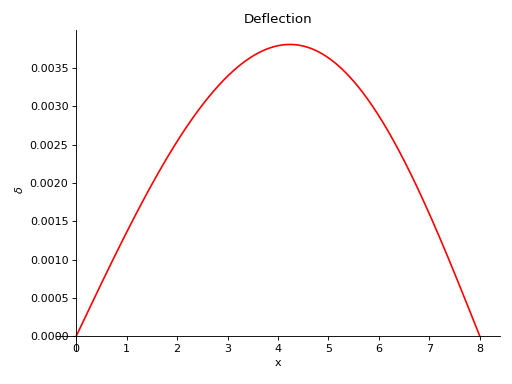>>> from sympy.physics.continuum_mechanics.beam import Beam >>> from sympy import symbols >>> E, I = symbols('E, I') >>> R1, R2 = symbols('R1, R2') >>> b = Beam(30, E, I) >>> b.apply_load(-8, 0, -1) >>> b.apply_load(R1, 10, -1) >>> b.apply_load(R2, 30, -1) >>> b.apply_load(120, 30, -2) >>> b.bc_deflection = [(10, 0), (30, 0)] >>> b.solve_for_reaction_loads(R1, R2) >>> b.deflection() (4000*x/3 - 4*SingularityFunction(x, 0, 3)/3 + SingularityFunction(x, 10, 3) + 60*SingularityFunction(x, 30, 2) + SingularityFunction(x, 30, 3)/3 - 12000)/(E*I)