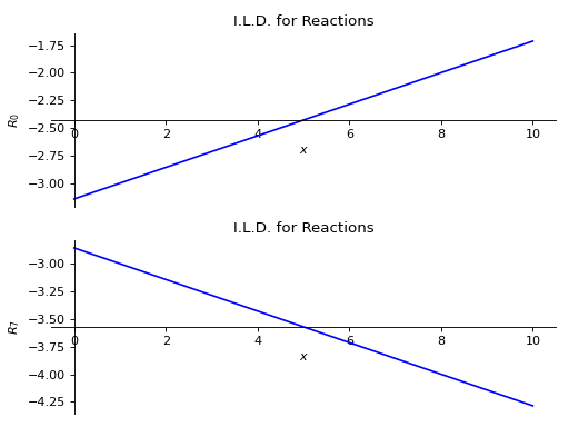 >>> from sympy import symbols >>> from sympy.physics.continuum_mechanics.beam import Beam >>> E, I = symbols('E, I') >>> R_0, R_10 = symbols('R_0, R_10') >>> b = Beam(10, E, I) >>> b.apply_support(0, 'roller') >>> b.apply_support(10, 'roller') >>> b.solve_for_ild_reactions(1,R_0,R_10) >>> b.ild_reactions {R_0: x/10 - 1, R_10: -x/10}