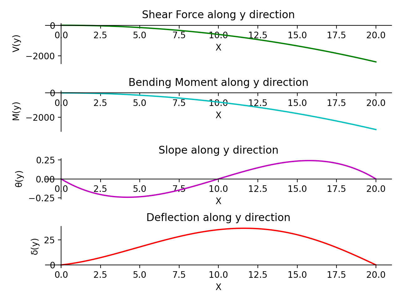 >>> from sympy.physics.continuum_mechanics.beam import Beam3D >>> from sympy import symbols >>> l, E, G, I, A, x = symbols('l, E, G, I, A, x') >>> b = Beam3D(20, E, G, I, A, x) >>> subs = {E:40, G:21, I:100, A:25} >>> b.apply_load(15, start=0, order=0, dir="z") >>> b.apply_load(12*x, start=0, order=0, dir="y") >>> b.bc_deflection = [(0, [0, 0, 0]), (20, [0, 0, 0])] >>> R1, R2, R3, R4 = symbols('R1, R2, R3, R4') >>> b.apply_load(R1, start=0, order=-1, dir="z") >>> b.apply_load(R2, start=20, order=-1, dir="z") >>> b.apply_load(R3, start=0, order=-1, dir="y") >>> b.apply_load(R4, start=20, order=-1, dir="y") >>> b.solve_for_reaction_loads(R1, R2, R3, R4) >>> b.solve_slope_deflection() >>> b.plot_loading_results('y',subs) PlotGrid object containing: Plot[0]:Plot object containing: [0]: cartesian line: -6*x**2 for x over (0.0, 20.0) Plot[1]:Plot object containing: [0]: cartesian line: -15*x**2/2 for x over (0.0, 20.0) Plot[2]:Plot object containing: [0]: cartesian line: -x**3/1600 + 3*x**2/160 - x/8 for x over (0.0, 20.0) Plot[3]:Plot object containing: [0]: cartesian line: x**5/40000 - 4013*x**3/90300 + 26*x**2/43 + 1520*x/903 for x over (0.0, 20.0)