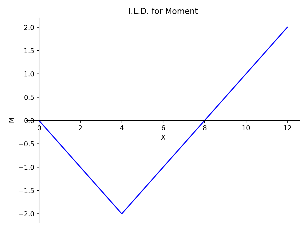 There is a beam of length 12 meters. There are two simple supports below the beam, one at the starting point and another at a distance of 8 meters. Calculate the I.L.D. equations for Moment at a distance of 4 meters under the effect of a moving load of magnitude 1kN.
