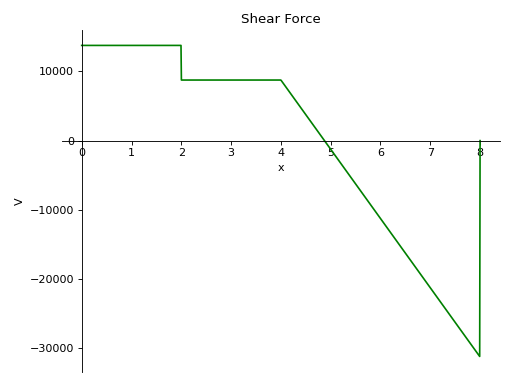 >>> from sympy.physics.continuum_mechanics.beam import Beam >>> from sympy import symbols >>> E, I = symbols('E, I') >>> R1, R2 = symbols('R1, R2') >>> b = Beam(30, E, I) >>> b.apply_load(-8, 0, -1) >>> b.apply_load(R1, 10, -1) # Reaction force at x = 10 >>> b.apply_load(R2, 30, -1) # Reaction force at x = 30 >>> b.apply_load(120, 30, -2) >>> b.bc_deflection = [(10, 0), (30, 0)] >>> b.load R1*SingularityFunction(x, 10, -1) + R2*SingularityFunction(x, 30, -1) - 8*SingularityFunction(x, 0, -1) + 120*SingularityFunction(x, 30, -2) >>> b.solve_for_reaction_loads(R1, R2) >>> b.reaction_loads {R1: 6, R2: 2} >>> b.load -8*SingularityFunction(x, 0, -1) + 6*SingularityFunction(x, 10, -1) + 120*SingularityFunction(x, 30, -2) + 2*SingularityFunction(x, 30, -1)