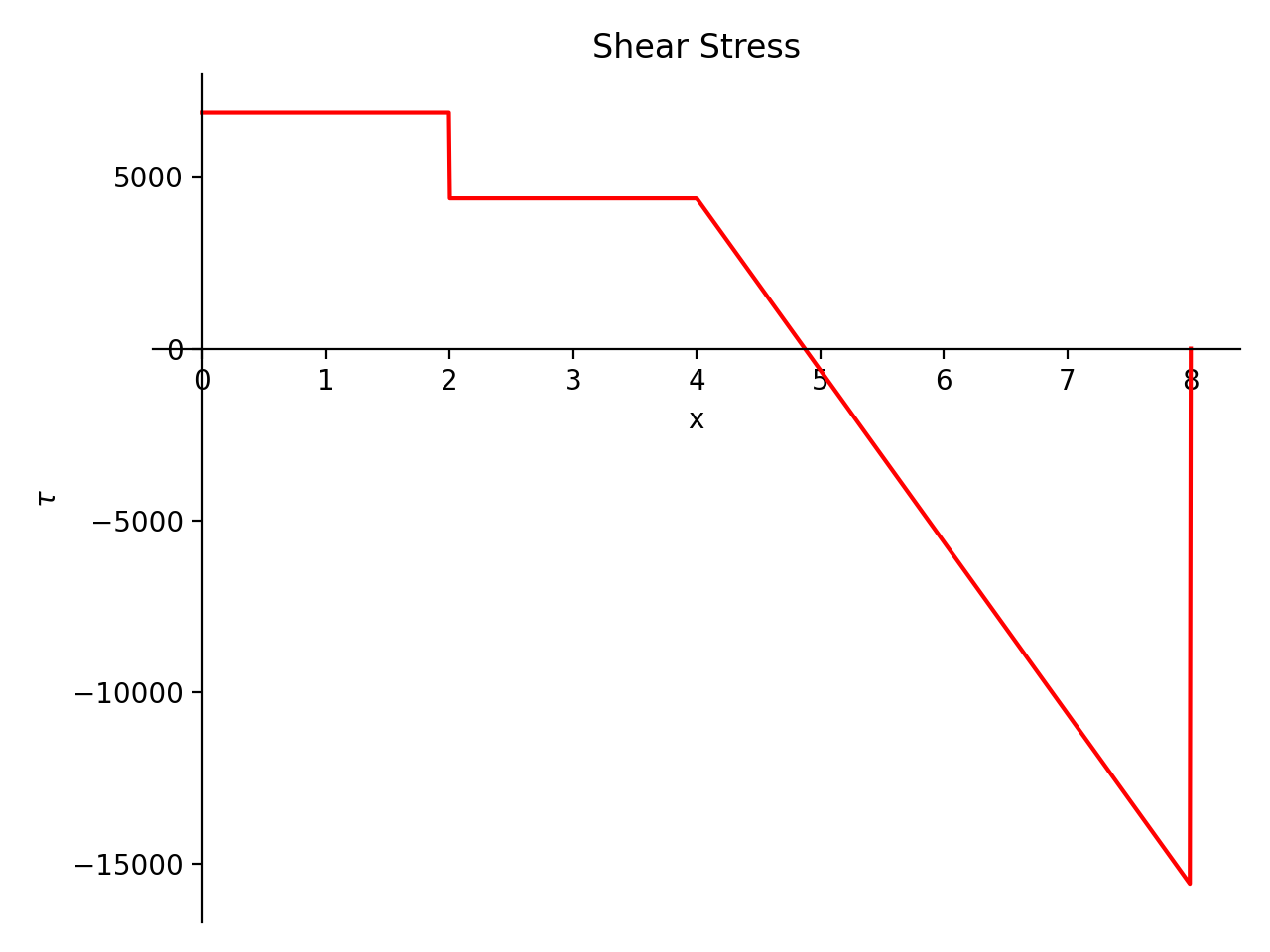 >>> from sympy.physics.continuum_mechanics.beam import Beam3D >>> from sympy import symbols >>> l, E, G, I, A, x = symbols('l, E, G, I, A, x') >>> b = Beam3D(20, E, G, I, 2, x) >>> b.apply_load(15, start=0, order=0, dir="z") >>> b.apply_load(12*x, start=0, order=0, dir="y") >>> b.bc_deflection = [(0, [0, 0, 0]), (20, [0, 0, 0])] >>> R1, R2, R3, R4 = symbols('R1, R2, R3, R4') >>> b.apply_load(R1, start=0, order=-1, dir="z") >>> b.apply_load(R2, start=20, order=-1, dir="z") >>> b.apply_load(R3, start=0, order=-1, dir="y") >>> b.apply_load(R4, start=20, order=-1, dir="y") >>> b.solve_for_reaction_loads(R1, R2, R3, R4) >>> b.plot_shear_stress() PlotGrid object containing: Plot[0]:Plot object containing: [0]: cartesian line: 0 for x over (0.0, 20.0) Plot[1]:Plot object containing: [0]: cartesian line: -3*x**2 for x over (0.0, 20.0) Plot[2]:Plot object containing: [0]: cartesian line: -15*x/2 for x over (0.0, 20.0)