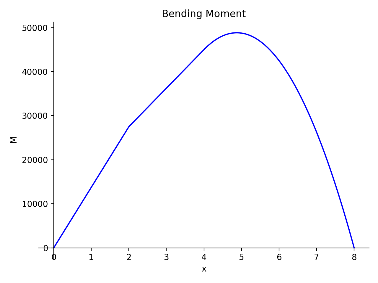 >>> from sympy.physics.continuum_mechanics.beam import Beam >>> from sympy import symbols >>> E, I = symbols('E, I') >>> R1, R2 = symbols('R1, R2') >>> b = Beam(30, E, I) >>> b.apply_load(-8, 0, -1) >>> b.apply_load(R1, 10, -1) >>> b.apply_load(R2, 30, -1) >>> b.apply_load(120, 30, -2) >>> b.bc_deflection = [(10, 0), (30, 0)] >>> b.solve_for_reaction_loads(R1, R2) >>> b.bending_moment() 8*SingularityFunction(x, 0, 1) - 6*SingularityFunction(x, 10, 1) - 120*SingularityFunction(x, 30, 0) - 2*SingularityFunction(x, 30, 1)