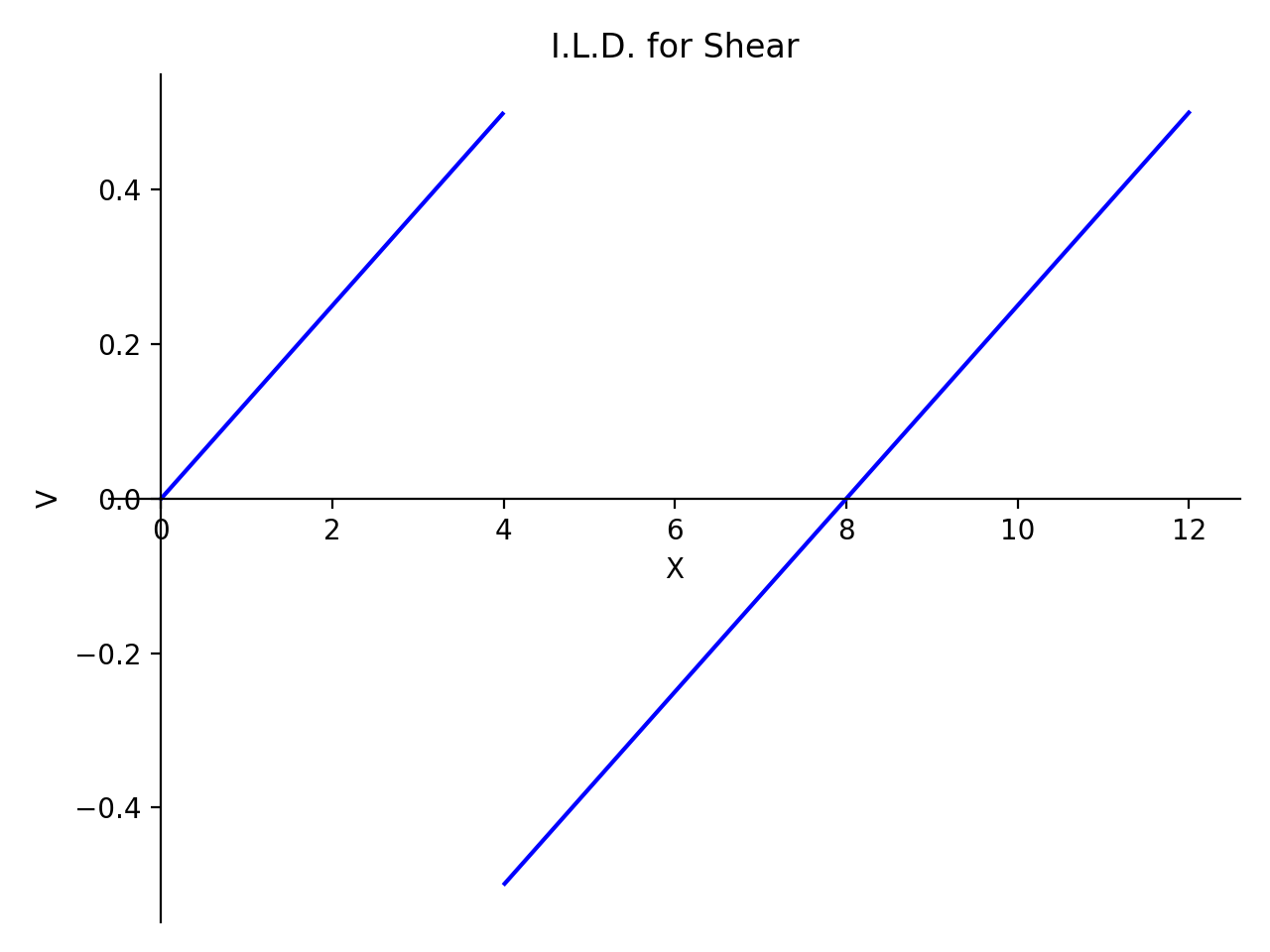 There is a beam of length 12 meters. There are two simple supports below the beam, one at the starting point and another at a distance of 8 meters. Calculate the I.L.D. equations for Shear at a distance of 4 meters under the effect of a moving load of magnitude 1kN.