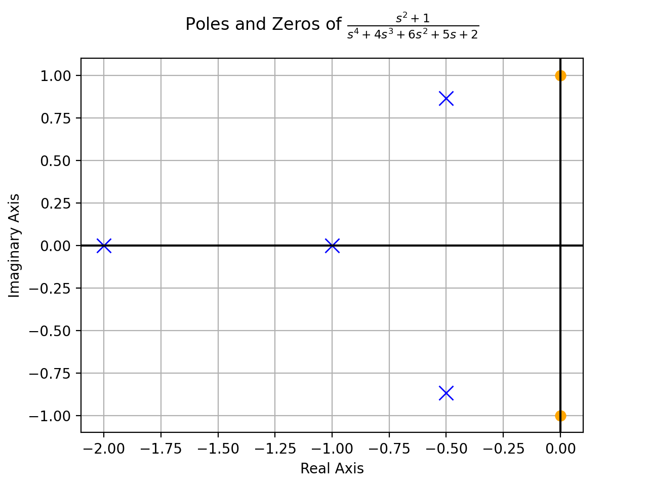 >>> from sympy.abc import s >>> from sympy.physics.control.lti import TransferFunction >>> from sympy.physics.control.control_plots import pole_zero_plot >>> tf1 = TransferFunction(s**2 + 1, s**4 + 4*s**3 + 6*s**2 + 5*s + 2, s) >>> pole_zero_plot(tf1)