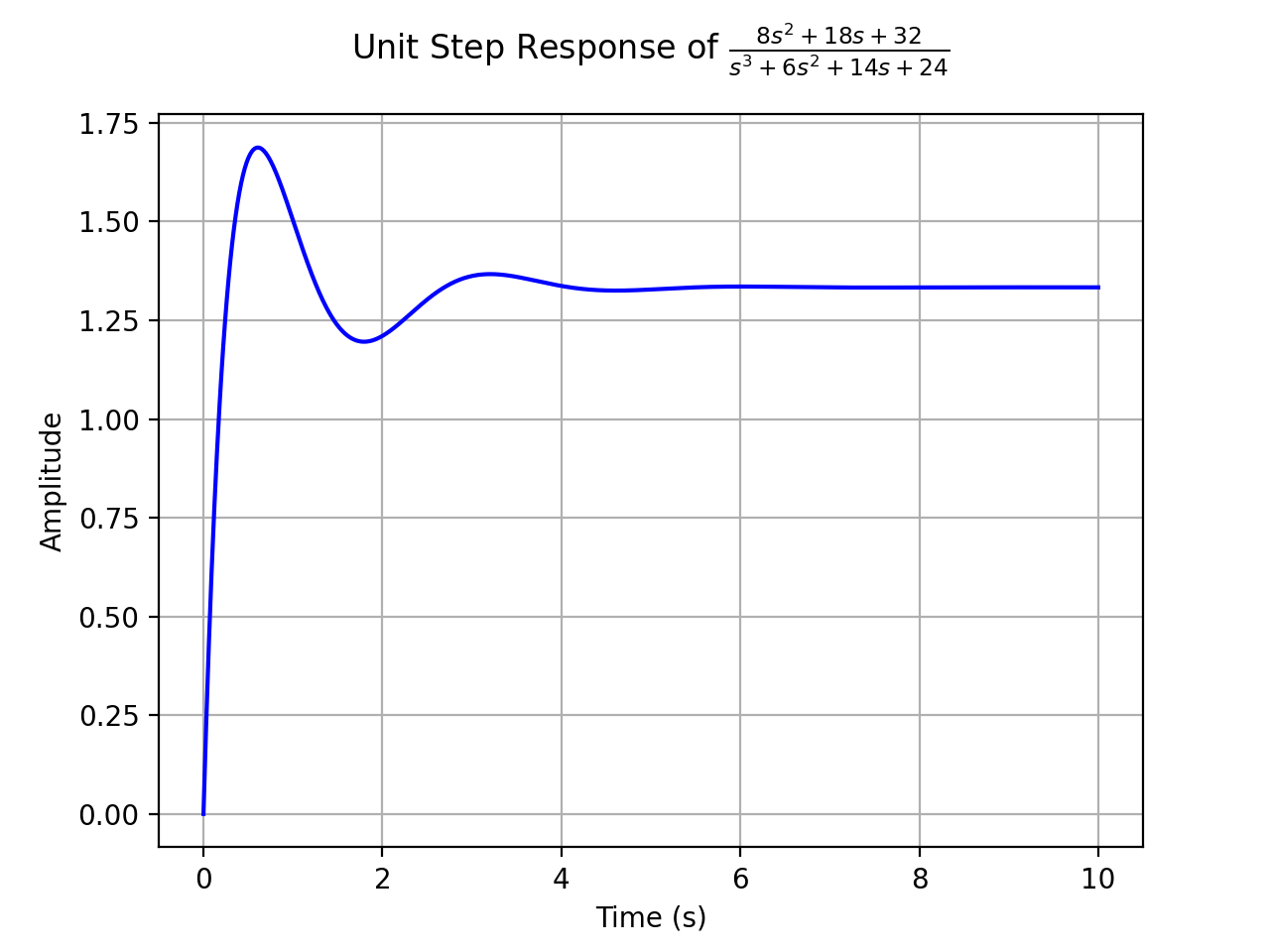 >>> from sympy.abc import s >>> from sympy.physics.control.lti import TransferFunction >>> from sympy.physics.control.control_plots import step_response_plot >>> tf1 = TransferFunction(8*s**2 + 18*s + 32, s**3 + 6*s**2 + 14*s + 24, s) >>> step_response_plot(tf1)