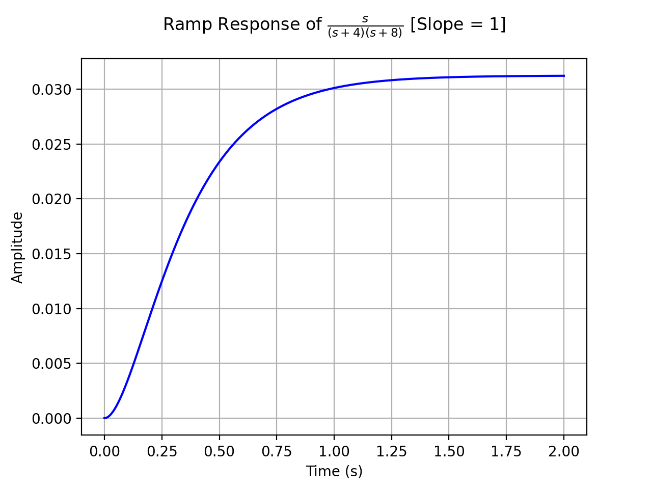 >>> from sympy.abc import s >>> from sympy.physics.control.lti import TransferFunction >>> from sympy.physics.control.control_plots import ramp_response_plot >>> tf1 = TransferFunction(s, (s+4)*(s+8), s) >>> ramp_response_plot(tf1, upper_limit=2)