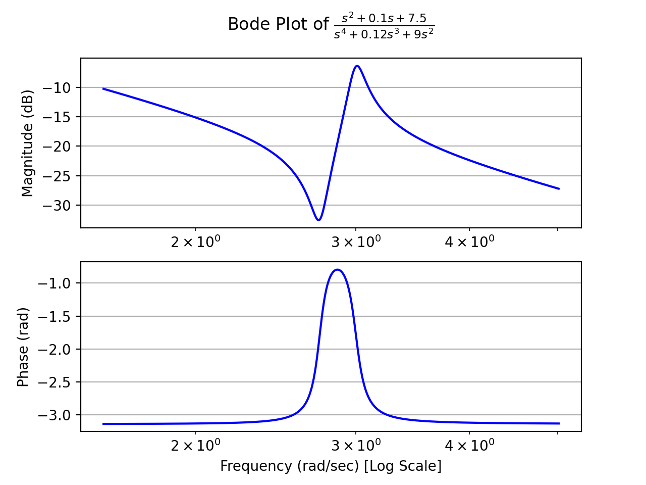 >>> from sympy.abc import s >>> from sympy.physics.control.lti import TransferFunction >>> from sympy.physics.control.control_plots import bode_plot >>> tf1 = TransferFunction(1*s**2 + 0.1*s + 7.5, 1*s**4 + 0.12*s**3 + 9*s**2, s) >>> bode_plot(tf1, initial_exp=0.2, final_exp=0.7)