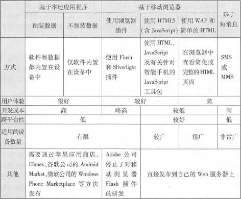 移动GIS开发有多种方法(表5. 1 ), 包括基于本地应用程序的方法、基于浏览器的方法和基于短消息的方法(KaPoor,2008)。 本节将讨论这些方法的优点和局限,并介绍如何根据应用项目的目的、要求和针对的用户群来选择合适的方法。